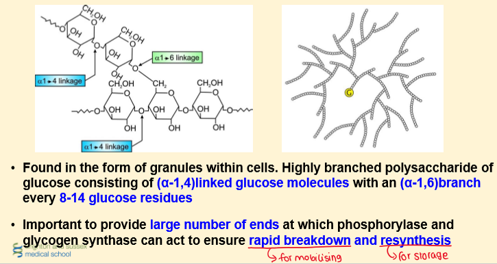 2) Stored in granules predominantly in liver and muscle as an energy reserve