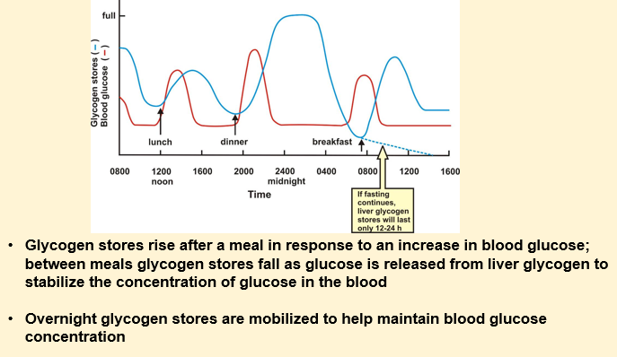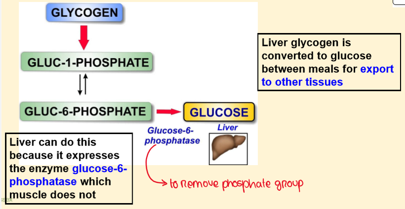 Liver glycogen is utilised to maintain plasma glucose levels between meals, whereas muscle glycogen is required to sustain muscle contraction