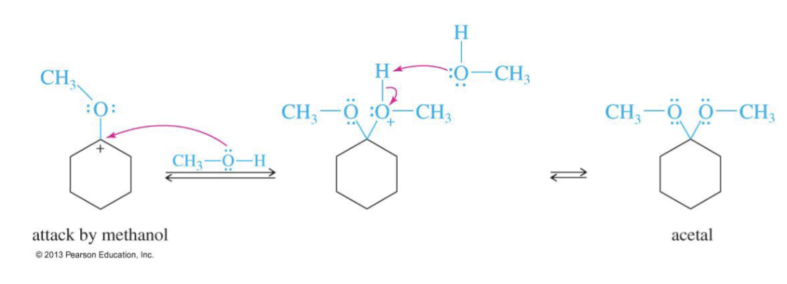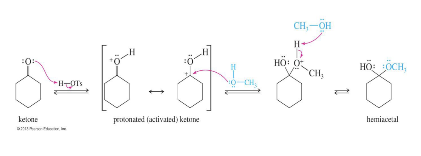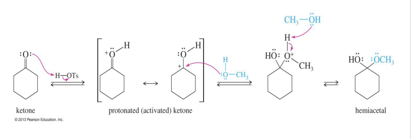 Step 2: Alcohol attacks the carbonyl carbon → tetrahedral intermediate → hemiacetal.