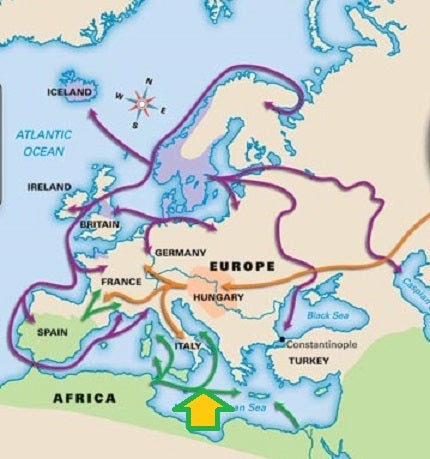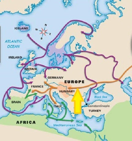 Use the LARGE, YELLOW arrow to identify the invading group in Europe circa 800 CE on the map below: