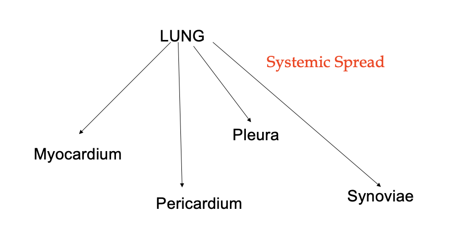 Lipoligossacharides (virulence factors) provoke host inflammatory response (e.g. cytokines) → damage to endothelial cells & vasculitis → thrombus formation