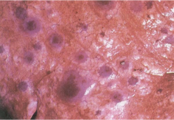 Intracytoplasmic inclusion bodies in lungs days 5-7