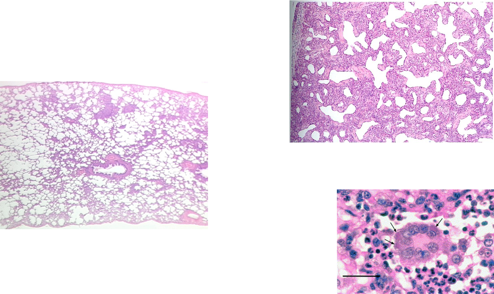^^ normal on L, R = tissue between alveoli infected w/ RSV -> inflam cells, MNGCs -> difficult exchange of gas across thicker surface