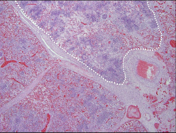 Dotted line shows the affected area, more purple due to more lymphocytes & monocytes