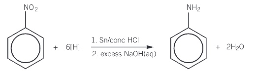 Nitrobenzene is heated under reflux with tin and hydrochloric acid to form the ammonium salt, which is then reacted with excess sodium hydroxide to produce the aromatic amine