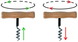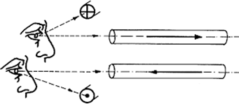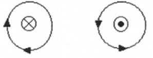 it toont aan als je in bovenaanzicht naar een geleider kijkt of de strrom weg van je gaat of naar je toe komt.