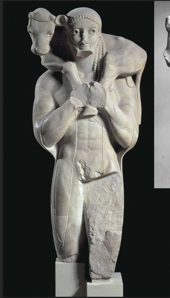 Calf Bearer (Moscophoros), dedicated by Rhonbos, Athens Acropolis, 560 BCE, marble, H. 5’ 5”