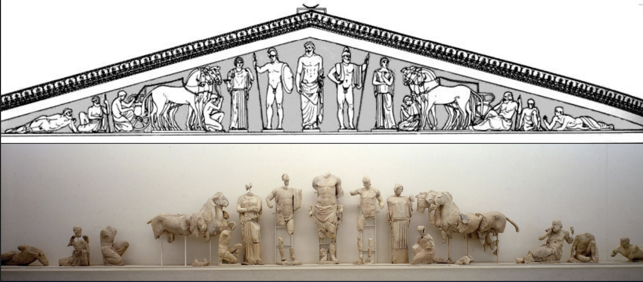 Temple of Zeus at Olympia, East (Front) Pediment: Preparation for the Chariot Race between Pelops (suitor) and Oinomaos (king of Pisa and father of Hippodamia) for the hand of Hippodamia, marble, H. of Zeus (as preserved) 10’ 2 ½, 560BCE