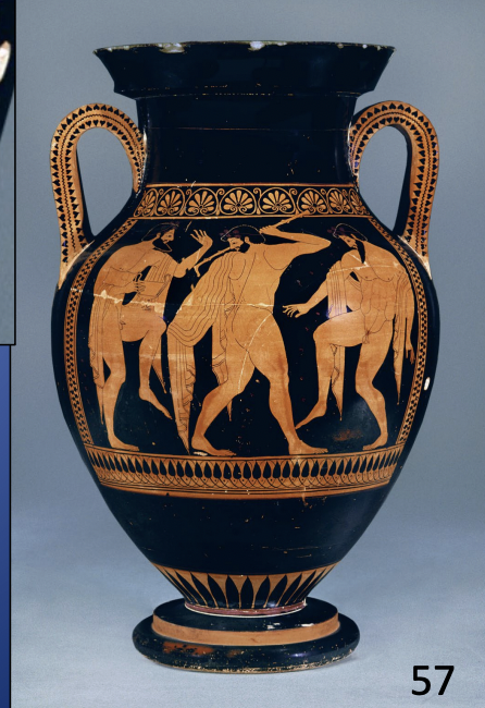Attic Red-figure Amphora by Euthymides: Three Revelers, from Vulci, Italy, ca. 510 BCE, H: 23 3/5”