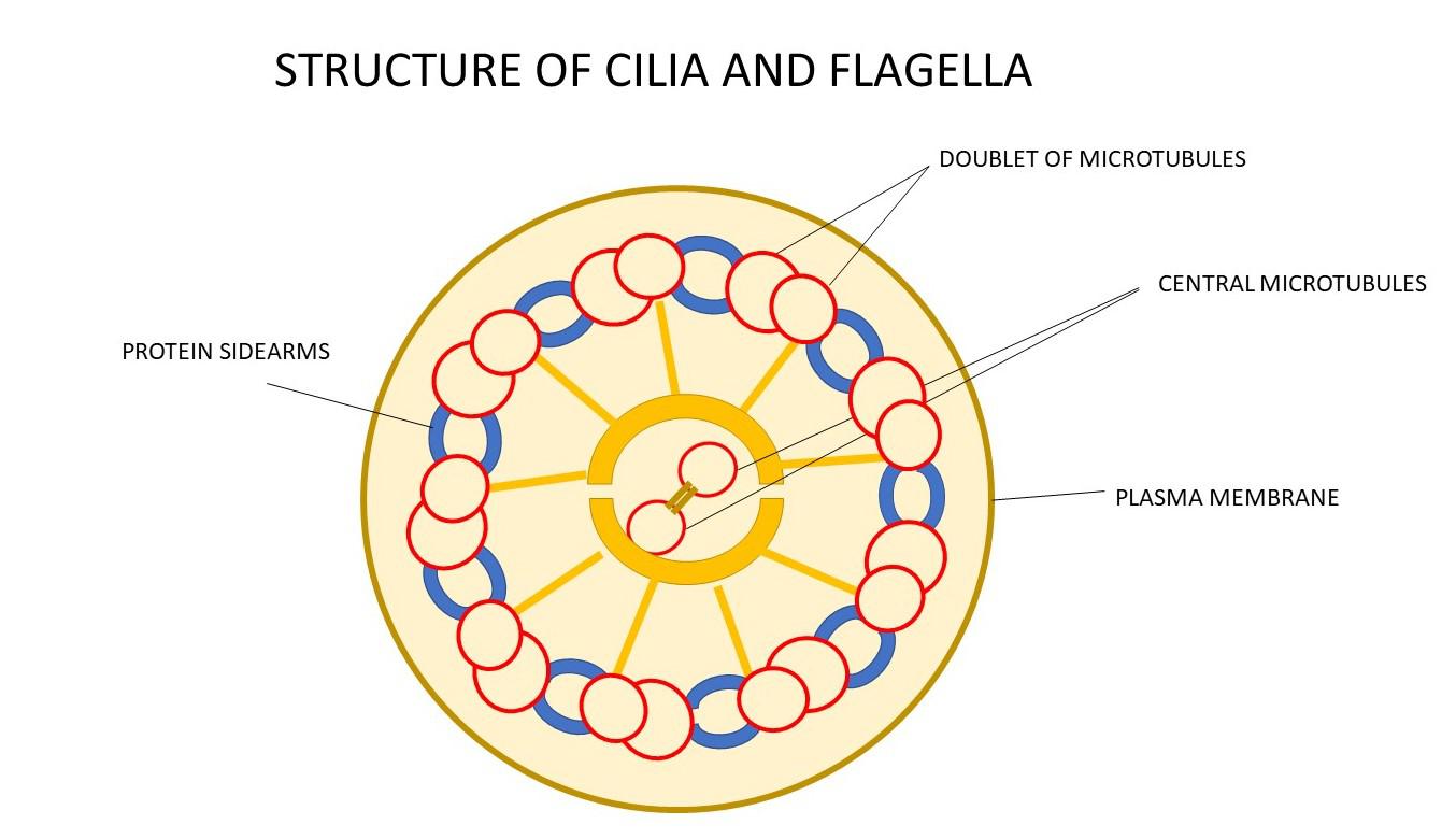 The cilia are made up of microtubules running inside the structure. They have a 9+2 arrangement, meaning that nine doublet microtubules surround a central pair of singlet microtubules.