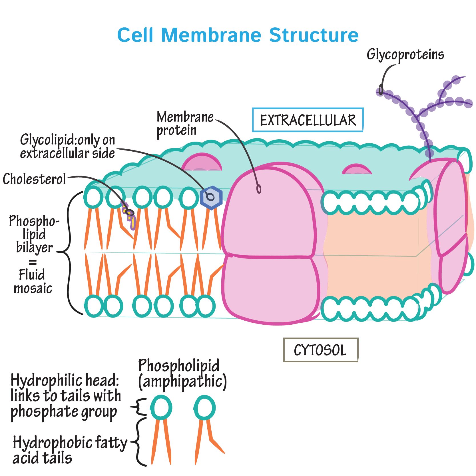 The cell membrane has a "fluid mosaic" structure consisting of a phospholipid bilayer with embedded proteins, cholesterol (in animal cells), and carbohydrates.