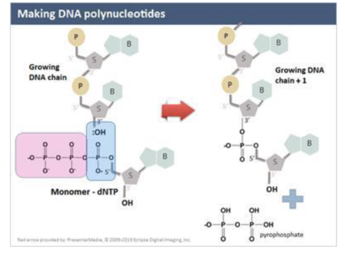 5’ end of dNTP is added to the 3’ OH of the growing DNA polynucleotide chain