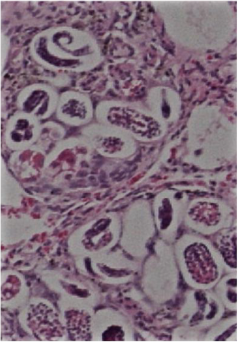 Worms reach maturity and lay eggs (females are ovovivparous) which are released into bloodstream