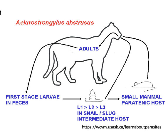 Snail intermediate host (Develop to L3) then ingested by cat or paratenic host which is then ingested by cat