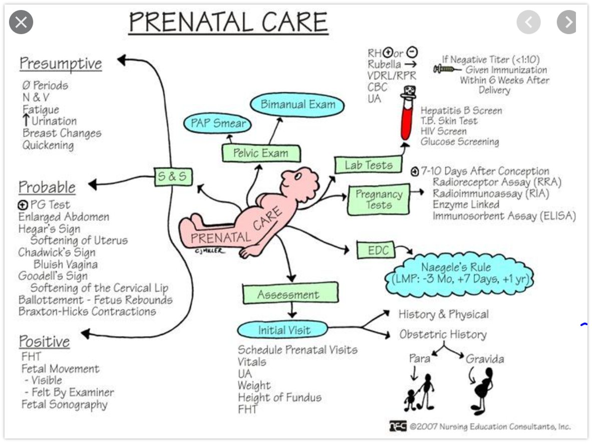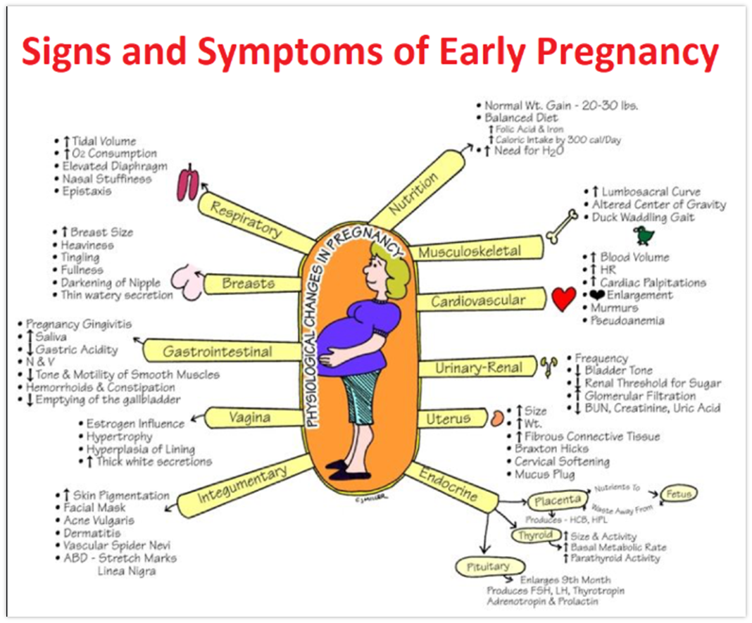 ex. Braxton Hicks contractions, Positive pregnancy test, Abdominal enlargement, Ballottement, Goodell’s sign, Chadwick’s sign, Hegar’s sign → can all be detected on a physical exam