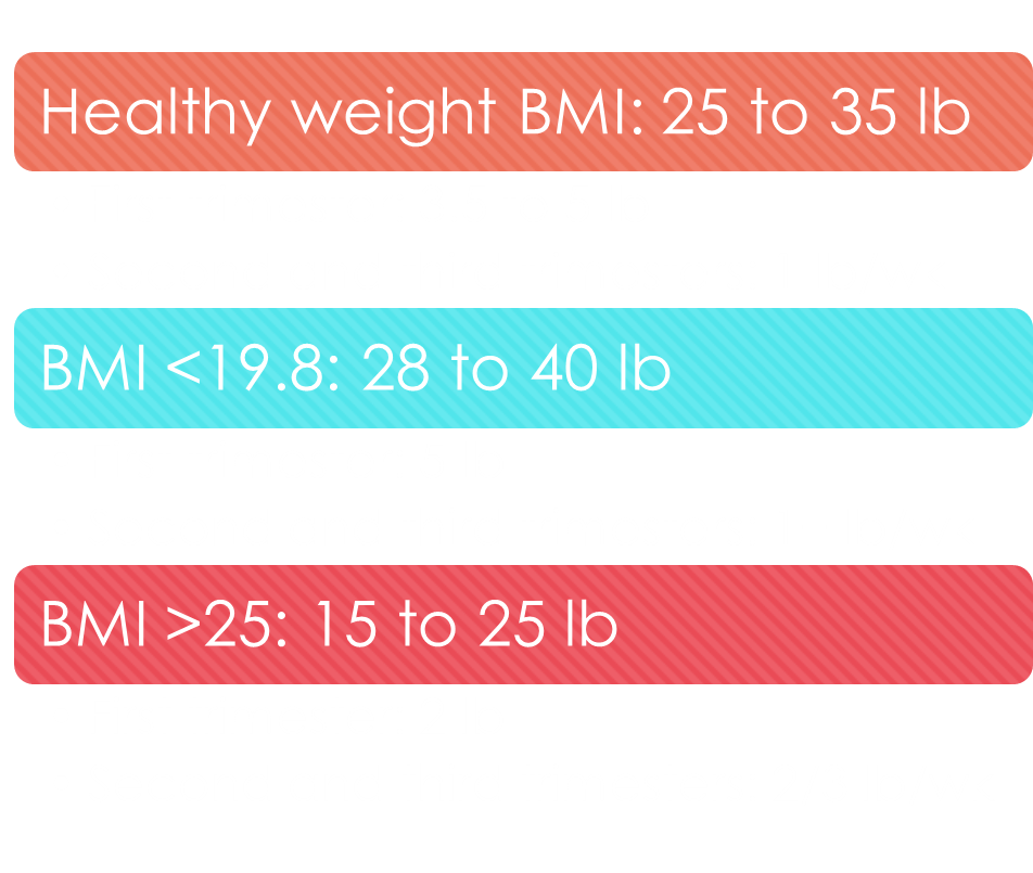 low BMI → first trimester 5 lbs, second and third trimester 1+ lb/wk; overall 28-40 lbs