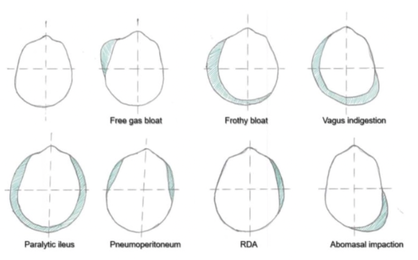 Percussion of ventral abdominal wall with hammer and spoon: Hollow sound → Fibrin adhesions/abomasal ulcers