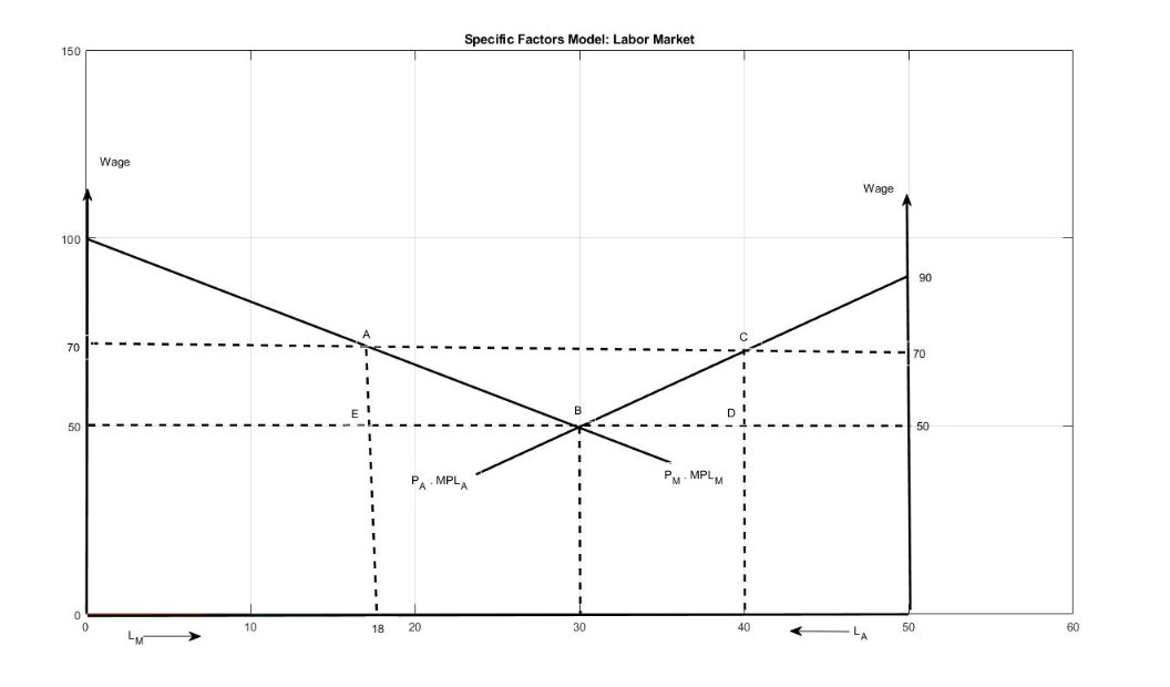 Chapter 3: The following figure illustrates the labor market equilibrium for a small open economy under free trade. The economy produces manufactured goods with capital and labor and agricultural goods with land and labor. The economy's labor endowment is fifty workers. According to the figure, the equilibrium number of workers in agriculture is equal to