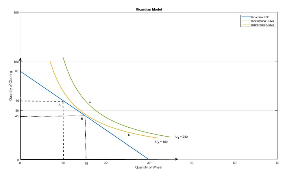 Chapter 2: According to the following figure, the economy obtains a utility level equal to ______under autarky equilibrium.