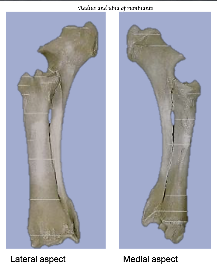 What is key structure of ulna and radius of ruminants that differ with dogs