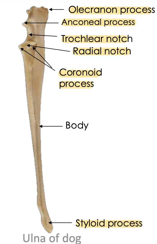 Olecranon process, Anconeal process, Body and distal epiphyses
