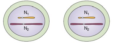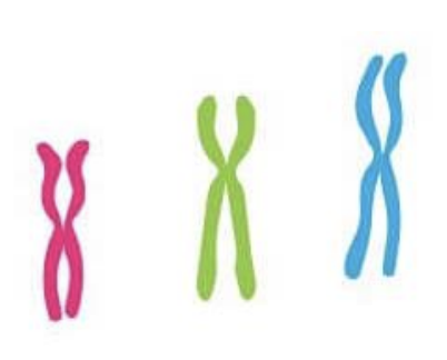 Pour chaque chromosome on a deux homologues (2n=3 → six chromosomes)