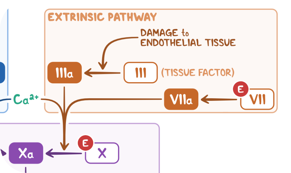 tissue factor (III) → IIIa via damage to endothelial tissue