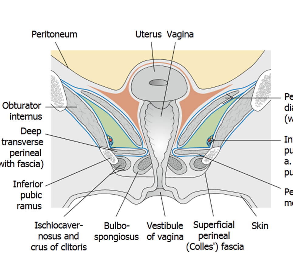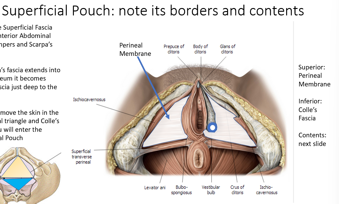 Perineal membrane separates it into superficial pouch (inferior) and deep pouch (superior).