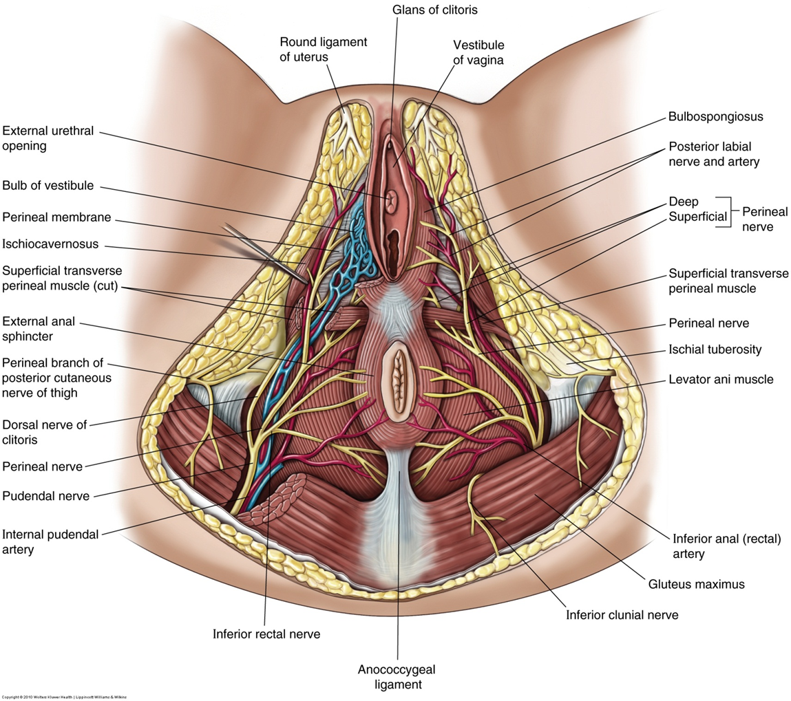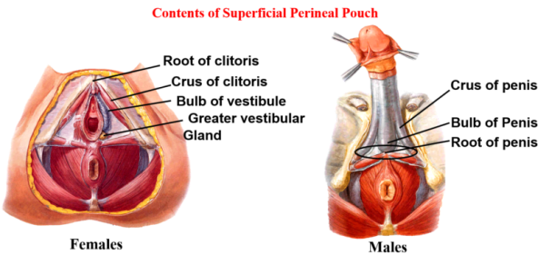 Erectile tissues (bulb of vestibule, clitoris), superficial perineal muscles, Bartholin glands.