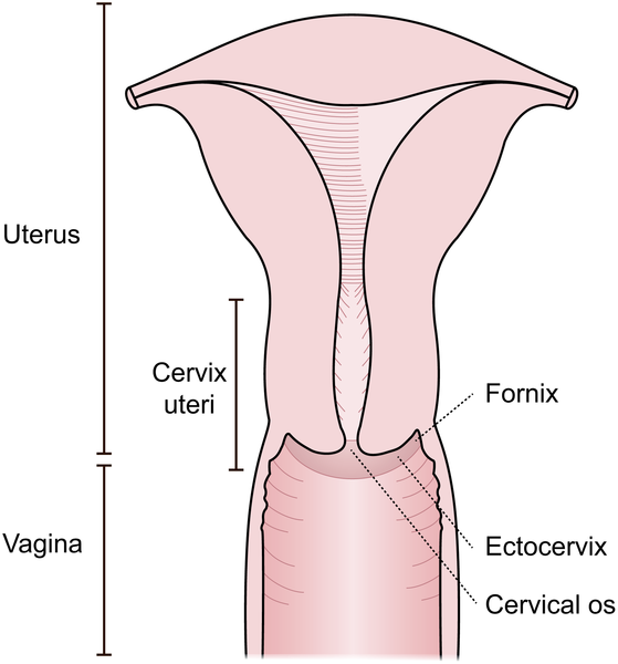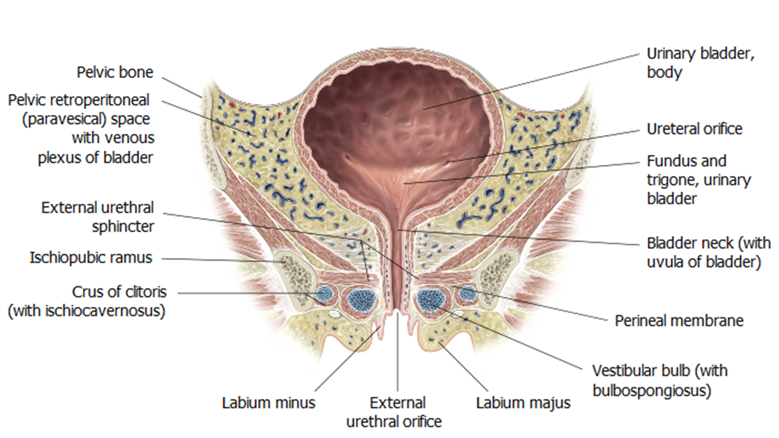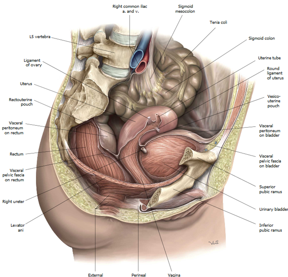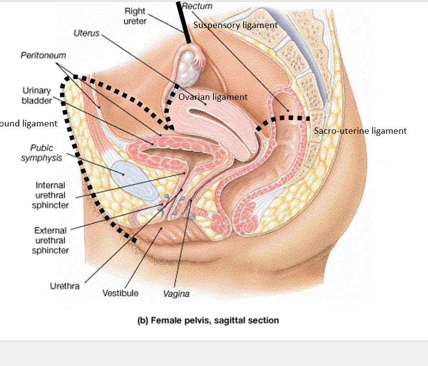Anterior: bladder; Posterior: rectum; Superior: loops of small intestine.