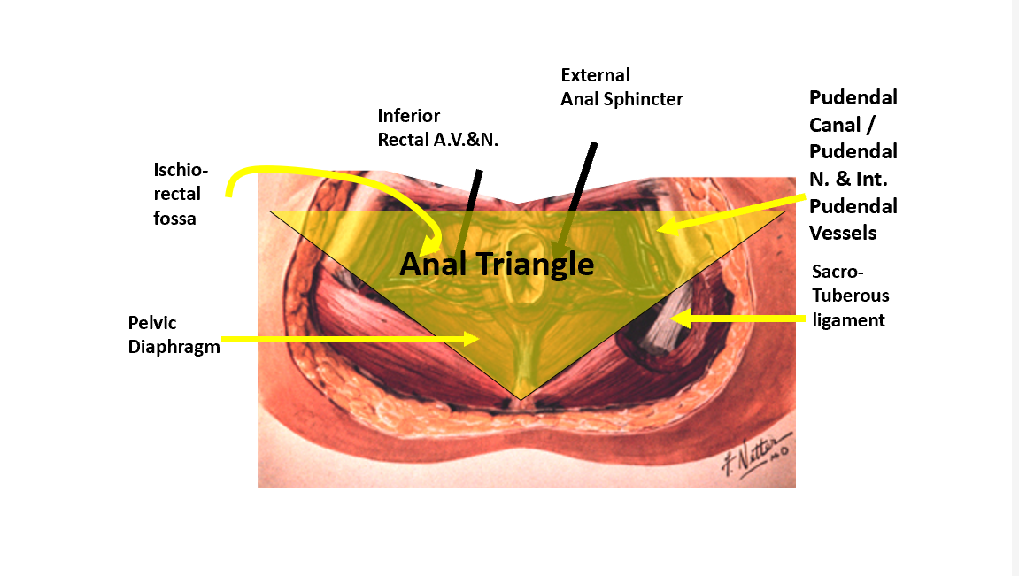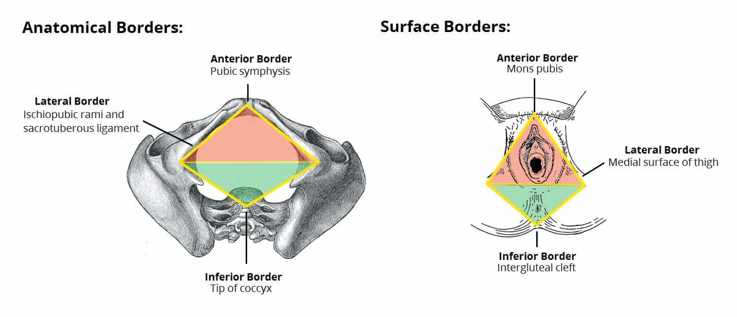 Anterior half of perineum; bounded by pubic symphysis and ischial tuberosities.