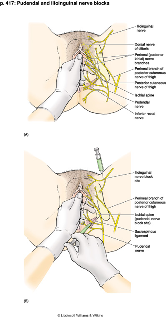 Ischial spine palpated transvaginally; needle inserted near sacrospinous ligament.