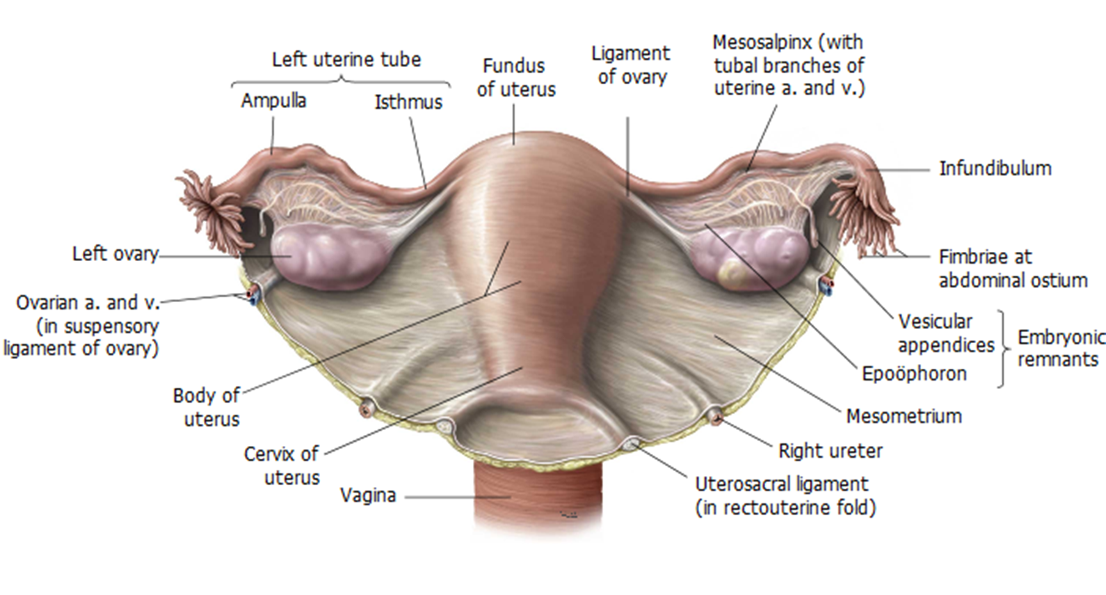 Vesicouterine pouch (between bladder and uterus), rectouterine pouch (Pouch of Douglas, between uterus and rectum).