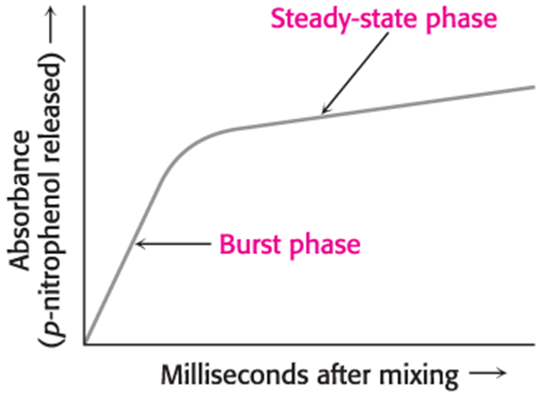 Studies with the chromogenic substrate reveal that catalysis by chymotrypsin occurs in two stages: a rapid step (pre-steady state) and a slower step (steady state).
