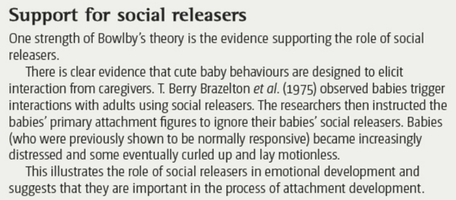 What is a strength of Bowlby’s theory as an explanation for attachment? Support for social releasers.