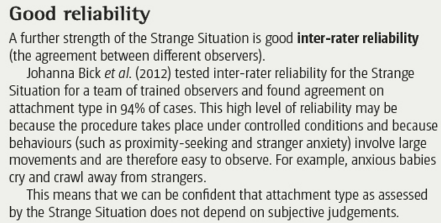 What is a strength of Ainsworth’s (1978) strange situation? reliability.