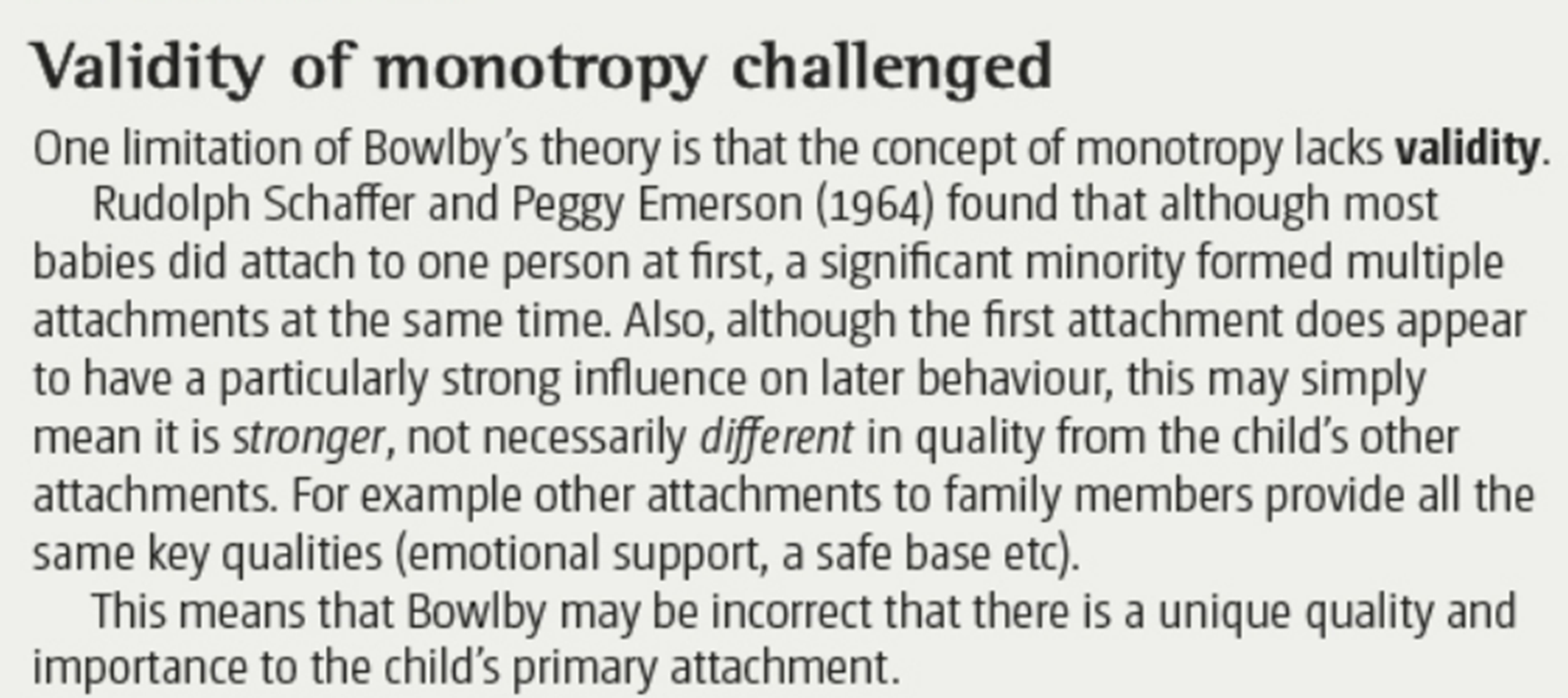 What is a limitation of Bowlby’s theory as an explanation for attachment? validity of monotropy.