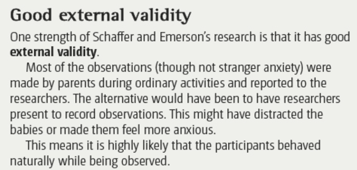 Schaffer & Emerson conducted a longitudinal study; the same children were followed-up and observed regularly. This increases the internal validity as they do not have confounding variables of individual differences between ppts (ppt variables).
