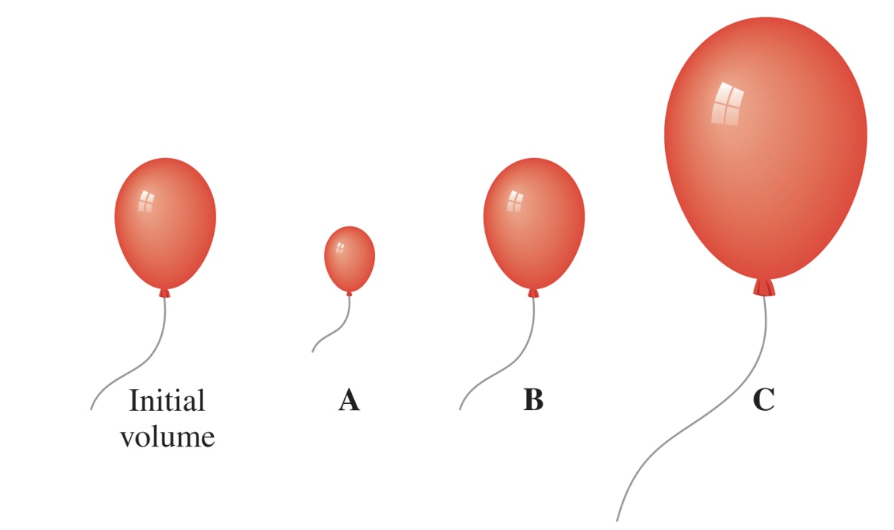 A sample of helium gas in a balloon has a volume of 6.4 L at a pressure of 0.70 atm. At 1.40 atm (T and n are constant), is the new volume represented by A, B, or C?