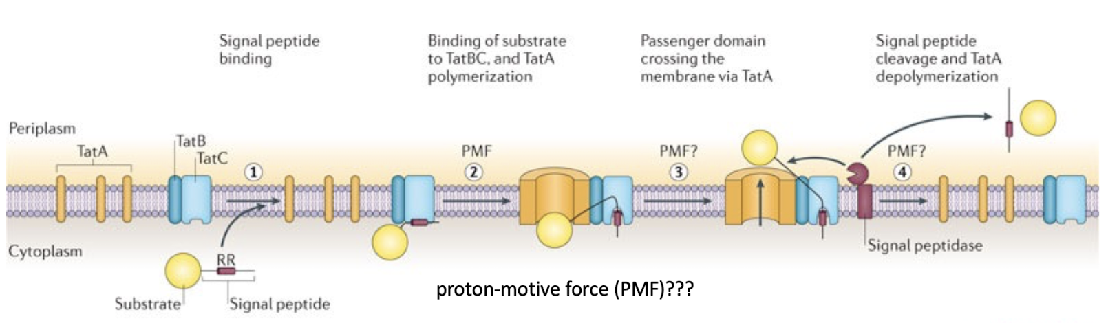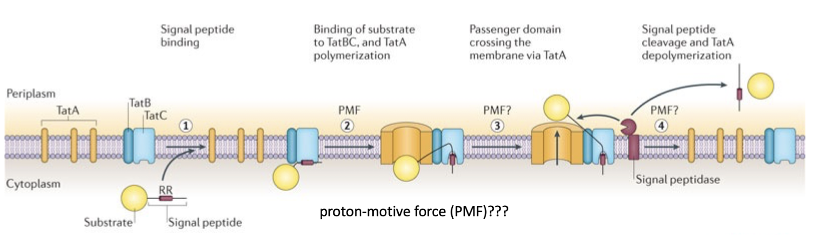 TatBC recognises a twin-arginine residue motif (RR) in the signal peptide.