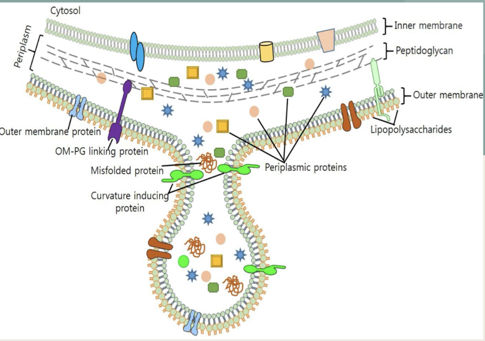 Spherical vesicles blebbed from OM in Gram-negative bacteria.