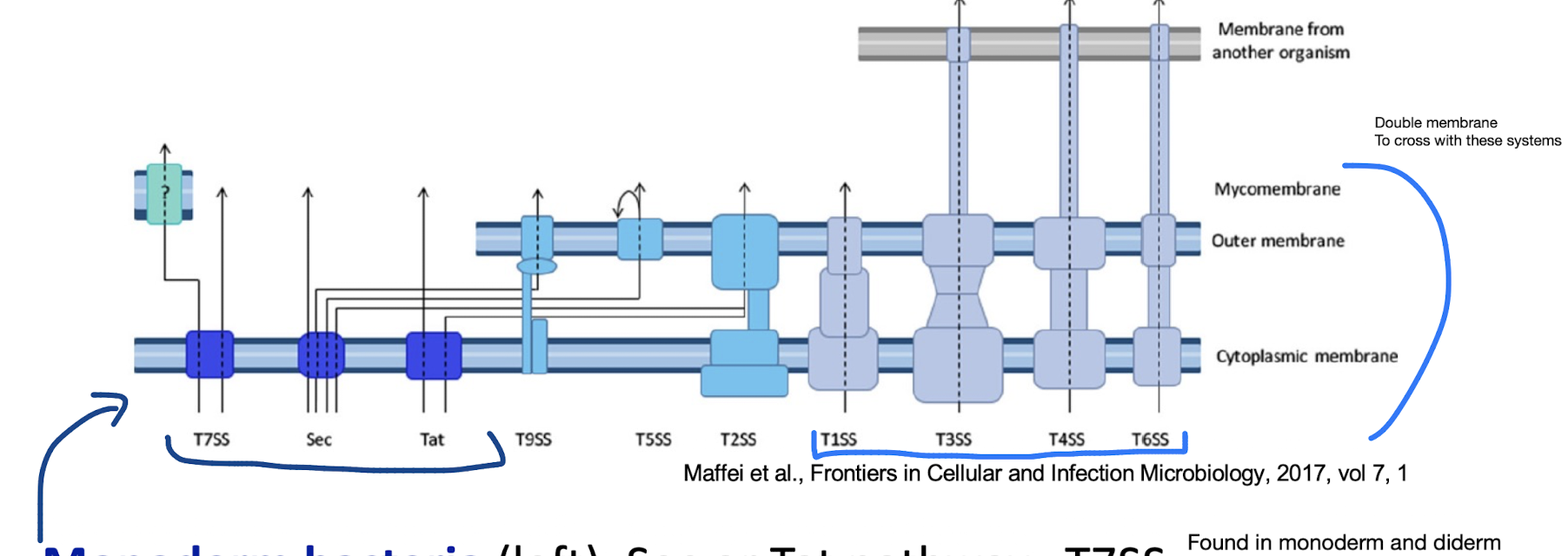 Diderm-LPS bacteria (centre and right), T1SS, T3SS, T4SS, or T6SS.