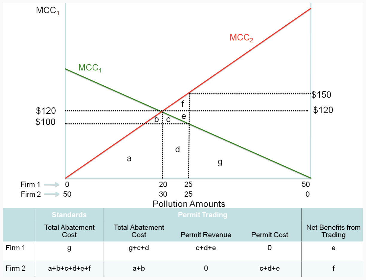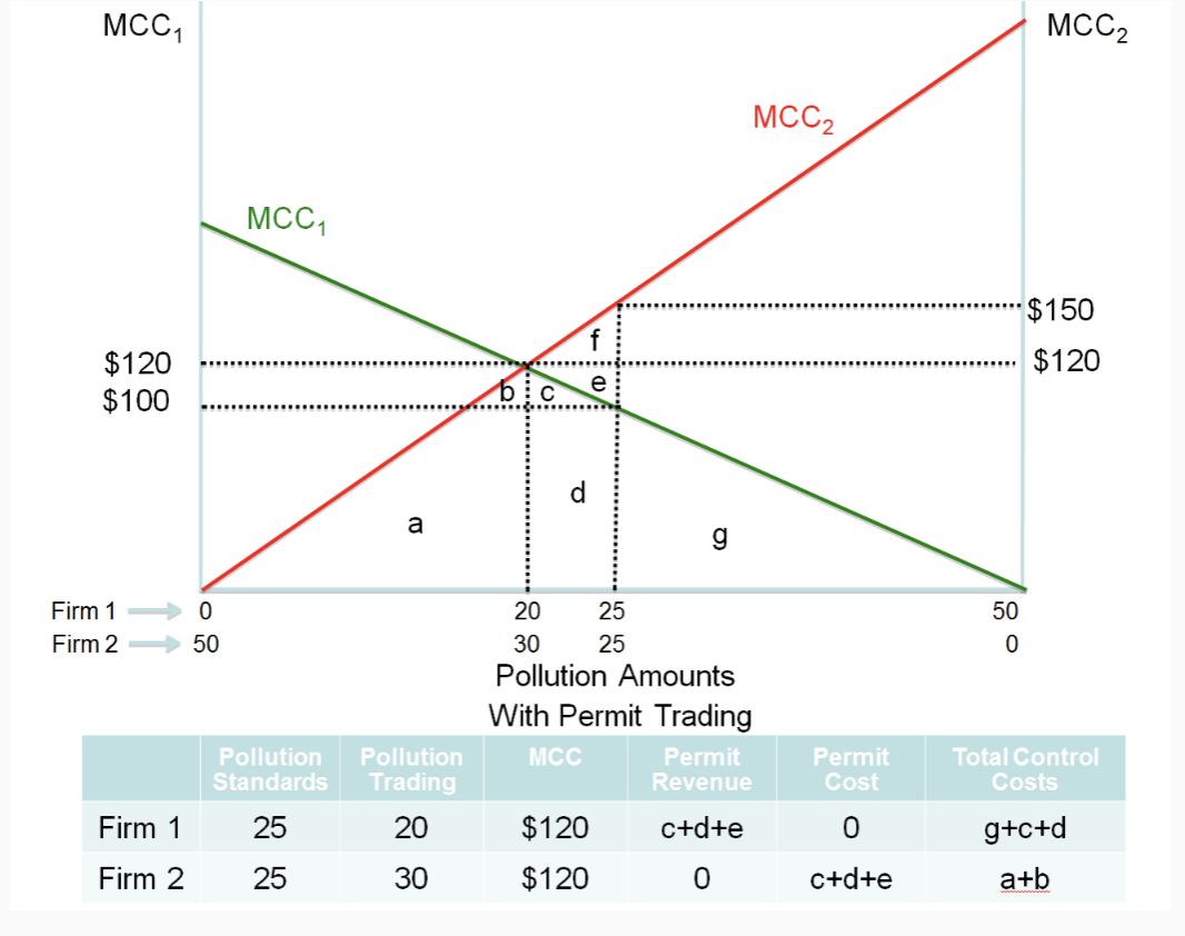 Firm 1 (lower cost firm) will sell 5 permits to Firm 2 and make revenue (c+d+e).
