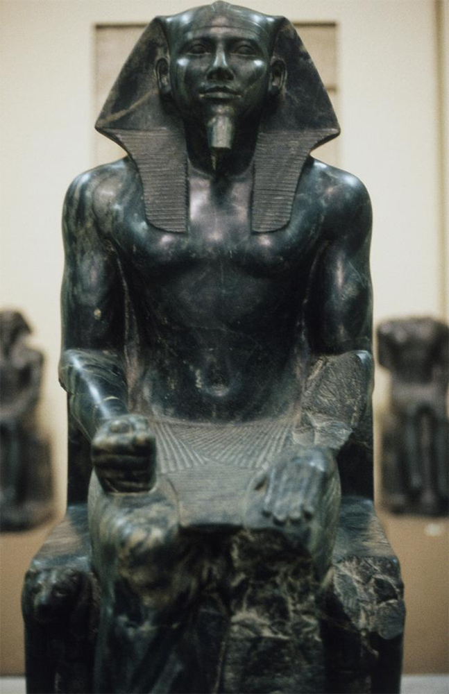 Horus the falcon sit behind his head / lotus and papyrus symbols on side of thrown represent the unification of upper and lower Egypt
