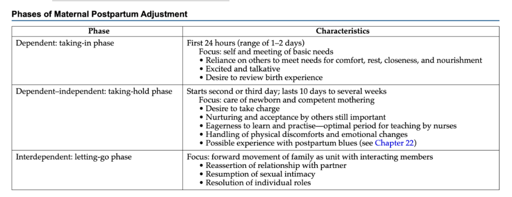 Dependent-independent (Taking-hold phase) – day 2–10 weeks: focus on newborn care, learning, nurturing; ideal for nurse-led education.