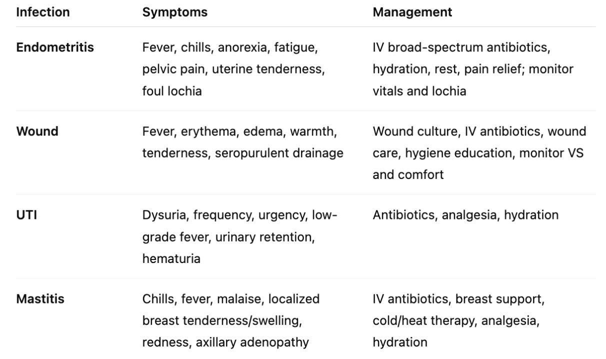POSTPARTUM COMPLICATIONS - Postpartum Infections: what are some symtoms and management for each?