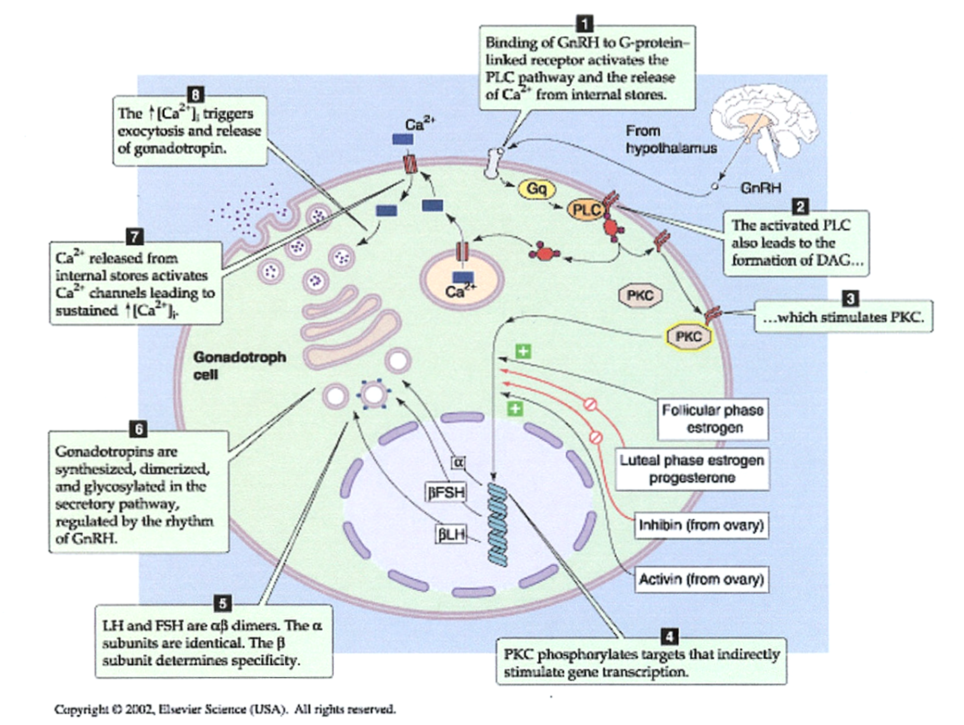 Gs leading to adenylyl cyclase, cAMP, PKA, transcription of enzymes that synthesize tessosterone