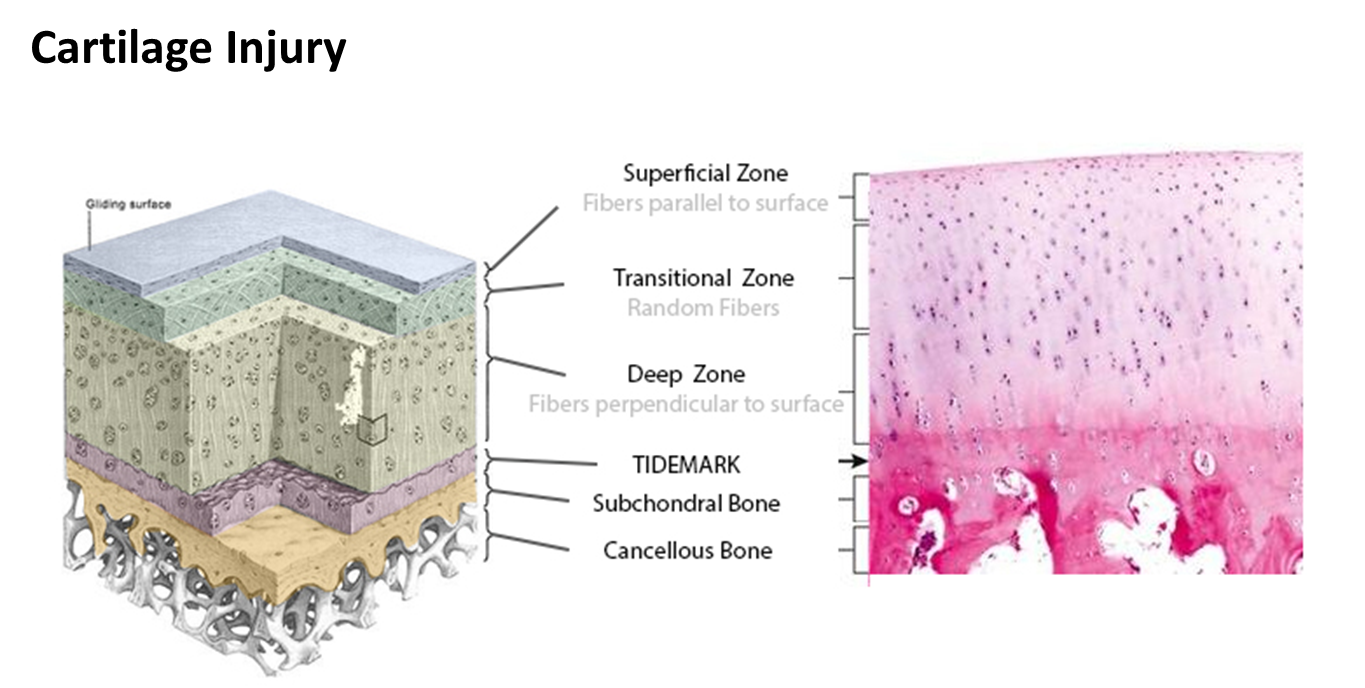 Cartilage is subdivided above and below the tidemark which separates the uncalcified layers of cartilage from the calcified cartilage