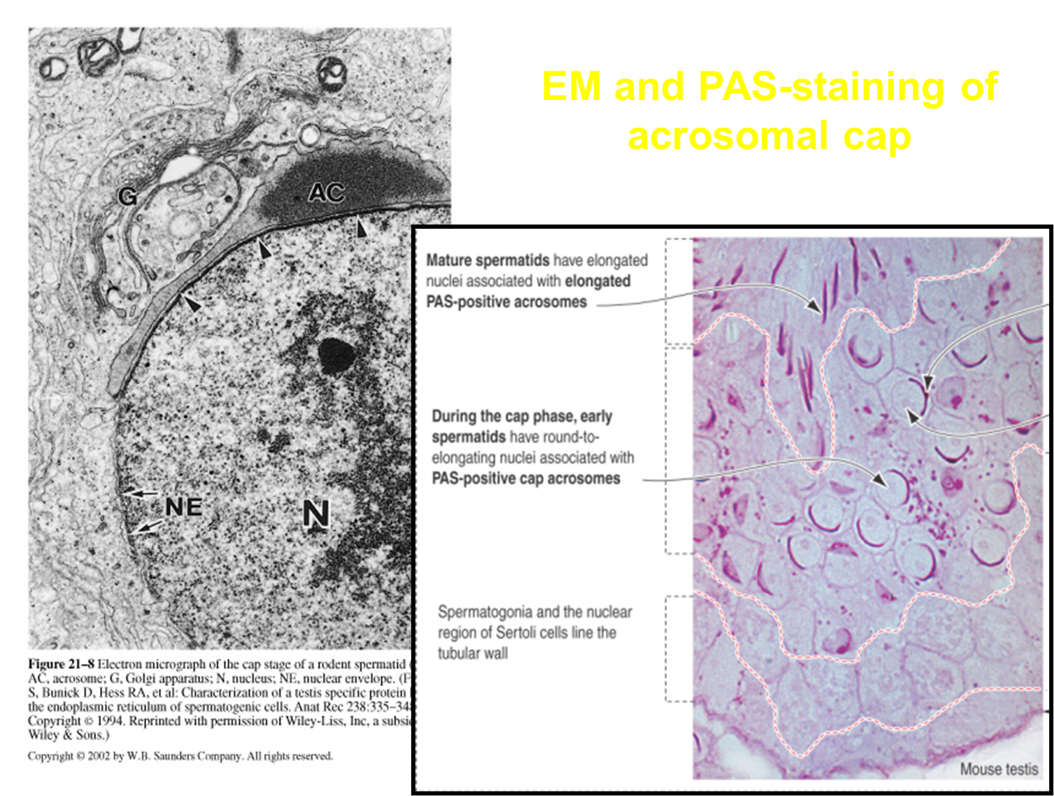 2) The Golgi migrates to the top of the cell and forms the acrosome