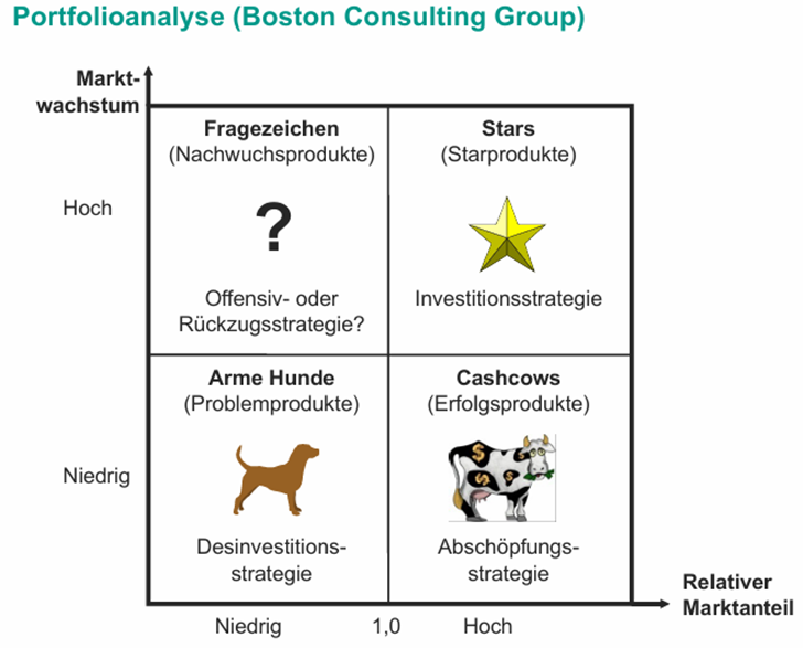 Erläutern Sie bitte die grundsätzliche Vorgehensweise und den Aufbau der Portfolioanalyse der Boston Consulting Group (BCG-Portfolio).